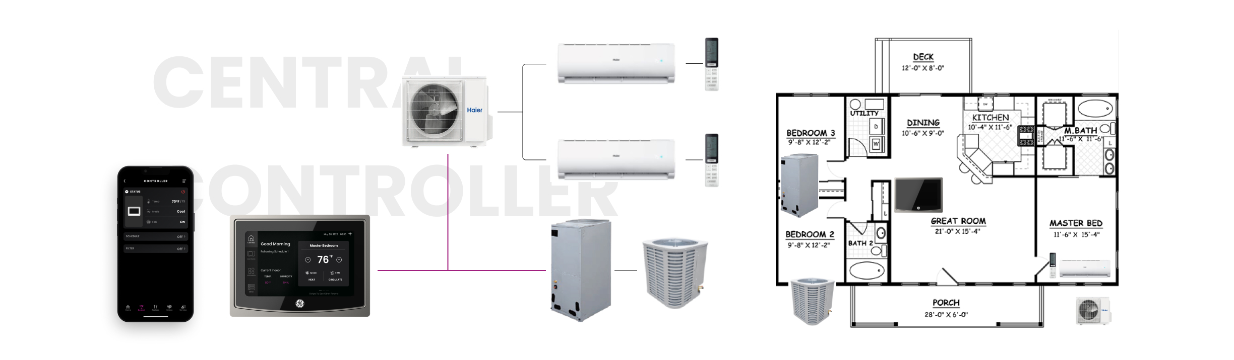 GE Central controller is a thermostat that lets you control both ductless split and unitary ducted HVAC systems in one place. it also provide seamless remote controls with SmartHQ app.