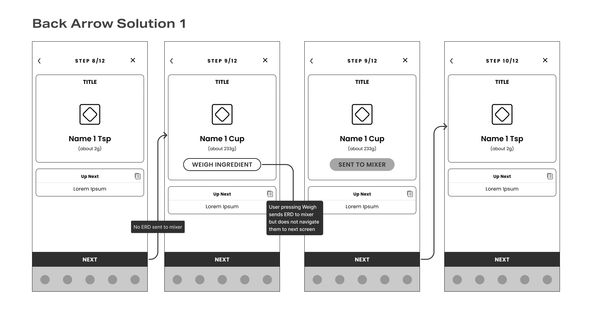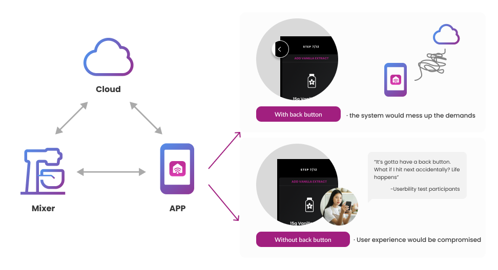 While implementing the project, unexpected challenges often arose. As an in-house designer, my role is to advocate for design and user needs. One vivid example was when engineers suggested removing the back button, arguing that the system would be messed up when users want to navigate back to previous steps while running a recipe. Their concern was that each step would triggers actions from the cloud to the mixer, such as weighing 10g of sugar.